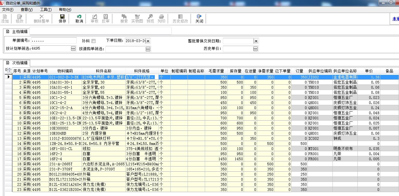 3. 自动分单(采购和委外):一键下完所有采购单和委外采购单,也支持请购单转采购单;可以控制从需求、厂商、单价、到交期等环节;把不同计划单、不同产品自动归类到同一厂商,支持单价按最
